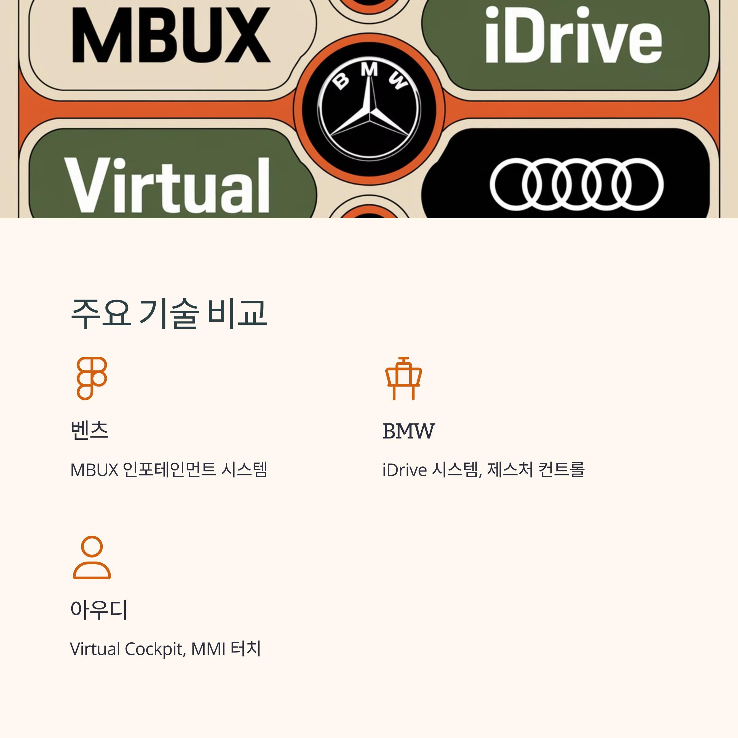 | 핵심 철학 | 벤츠는 럭셔리와 편안함, BMW는 스포츠 드라이빙, 아우디는 첨단 기술을 강조합니다. |