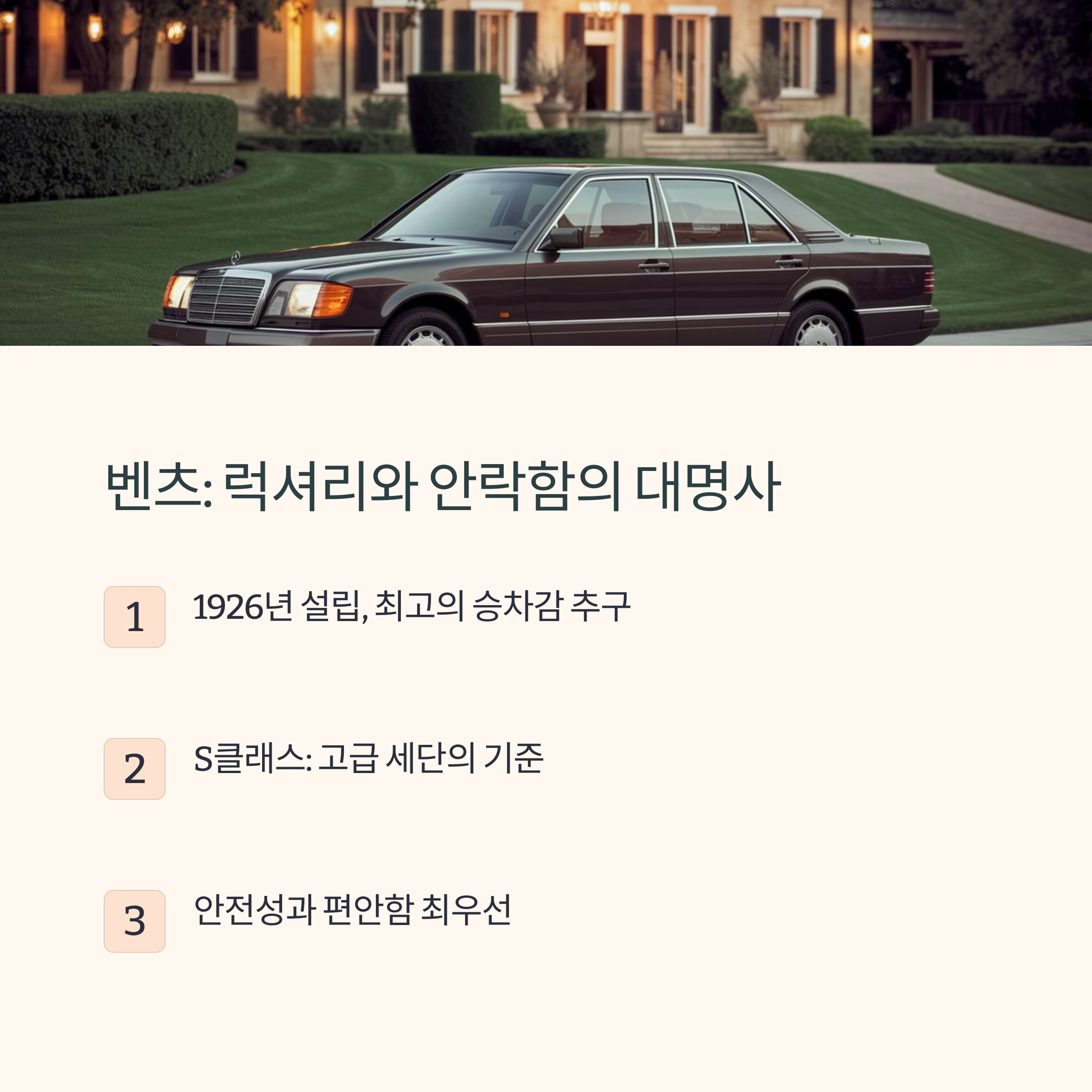 벤츠는 럭셔리와 안락함을 대표하는 브랜드입니다. 1926년 설립된 이래 최고의 승차감을 제공하는 차량을 생산해 왔으며, S클래스는 글로벌 시장에서 고급 세단의 기준으로 평가받고 있습니다. 벤츠의 차량은 안전성과 편안함을 최우선으로 설계되어 있으며, 고급스러운 내부 디자인과 첨단 기술이 조화를 이루고 있습니다.