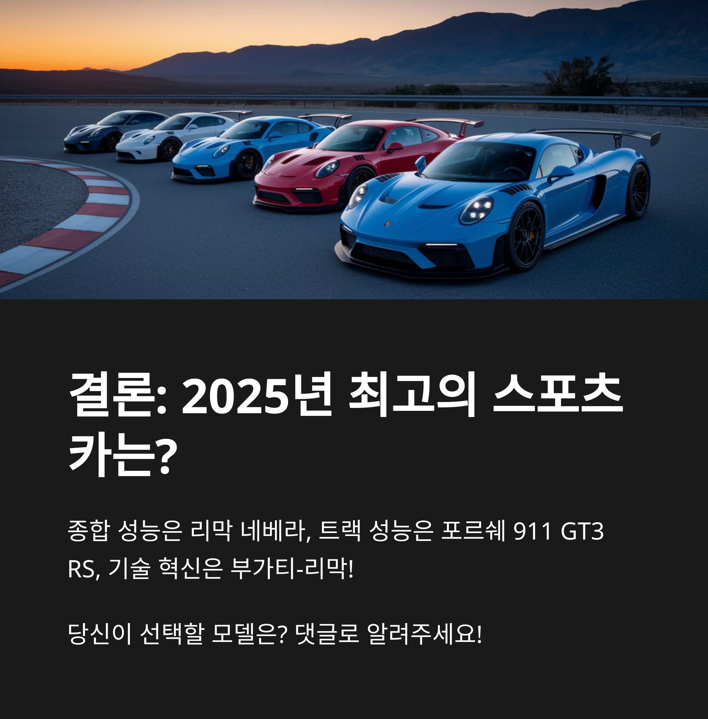 2025년 스포츠카 시장은 기술 혁신과 빠른 변화가 이루어지는 흥미로운 시기가 될 것입니다. 전기차와 내연기관 모델이 공존하며 각기 다른 매력을 제공하고 있으며, 제조사들은 끊임없이 성능을 개선하고 있습니다. 앞으로도 더 빠르고 강력한 스포츠카들이 등장할 예정이니 자동차 팬들의 기대감을 한껏 높이고 있습니다.