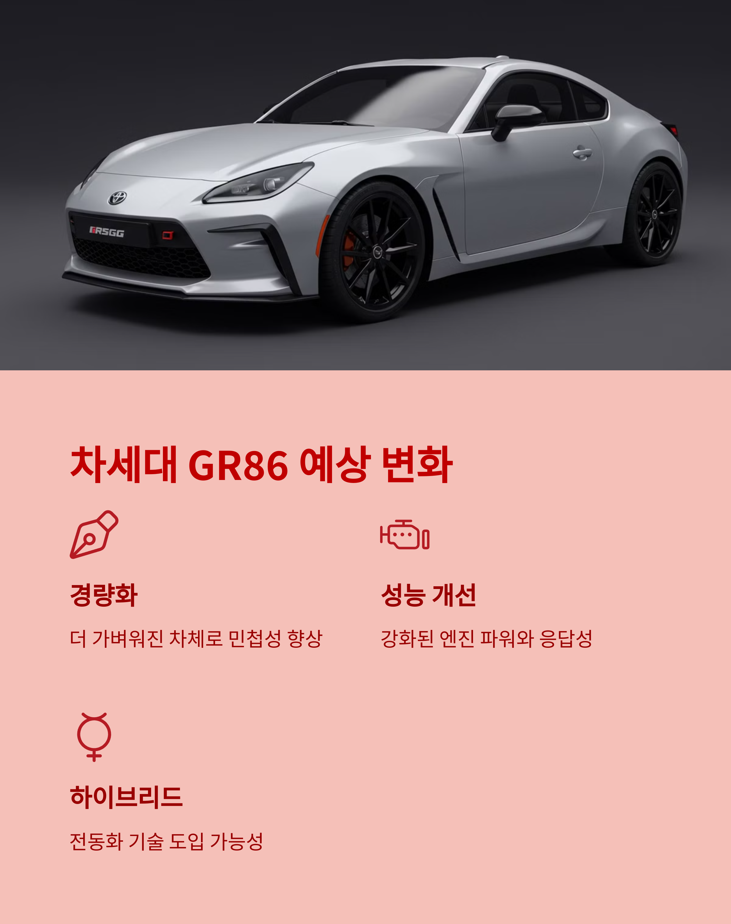 현재 GR86은 2.4L 자연흡기 박서 엔진을 사용하고 있지만, 차세대 모델에서는 터보차저 또는 하이브리드 기술이 추가될 가능성이 높습니다.