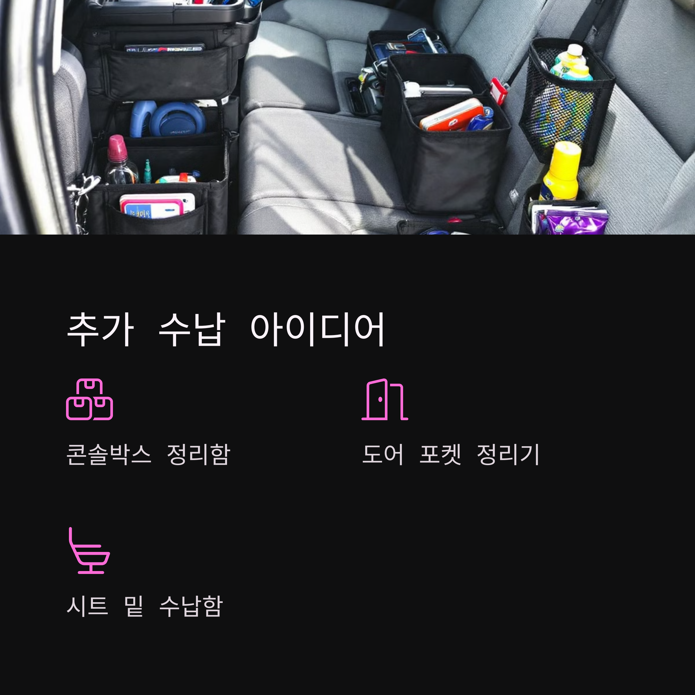 | 헤드레스트 수납 | 트렁크 정리함 | 대시보드 정리 |
