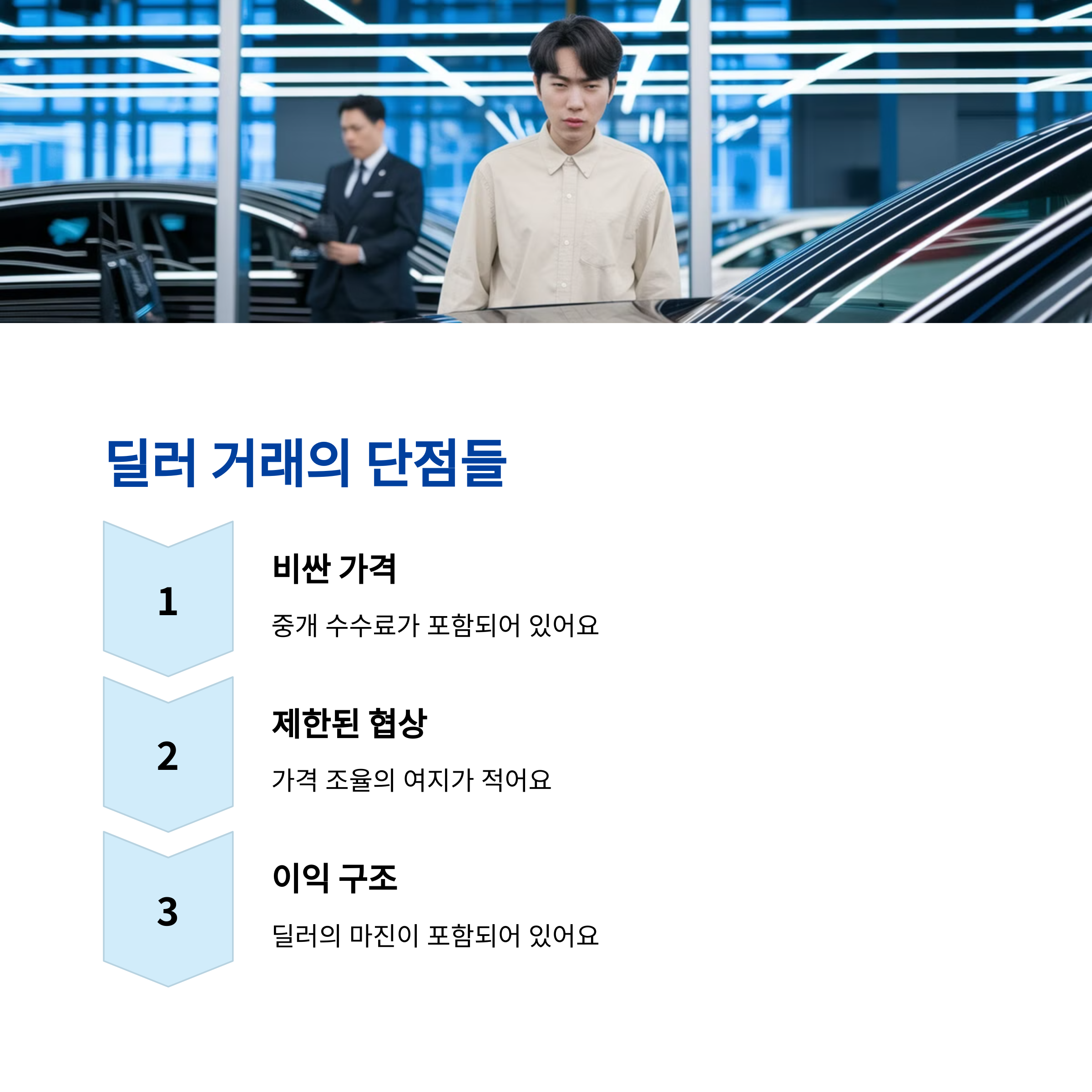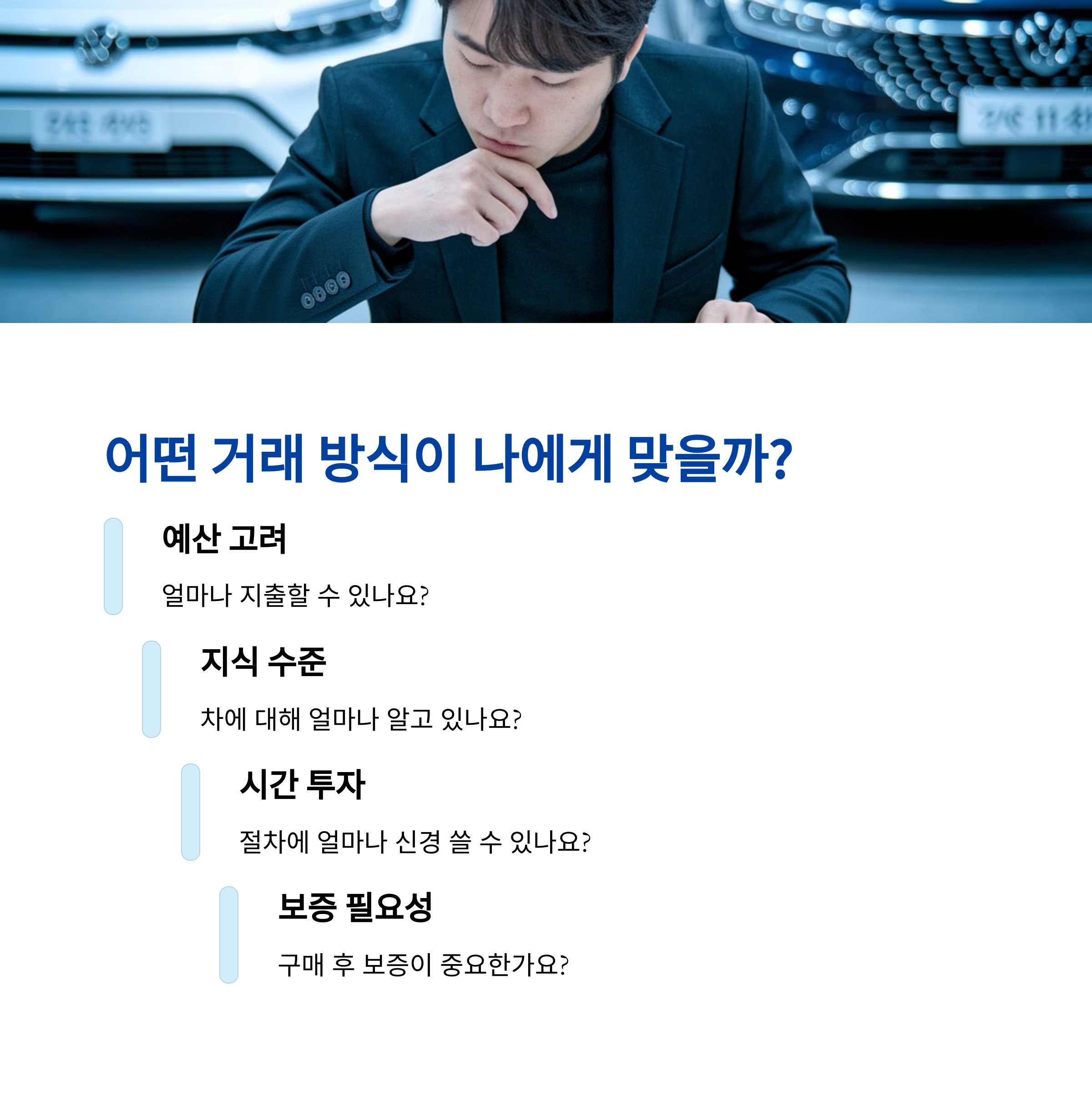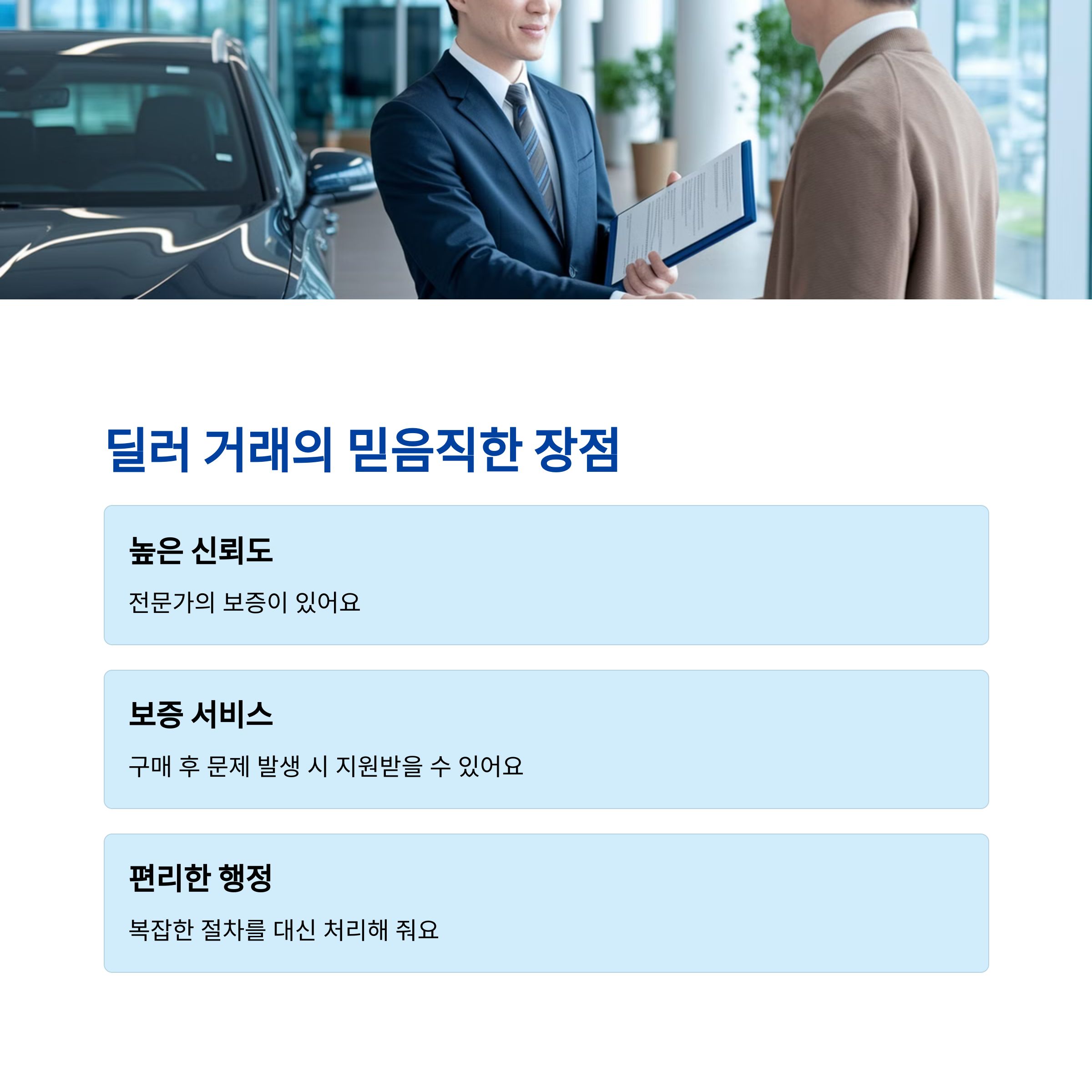 | 거래 방식 선택 | 직접 거래, 검증 어려움 | 딜러 중개, 보증 가능 |